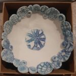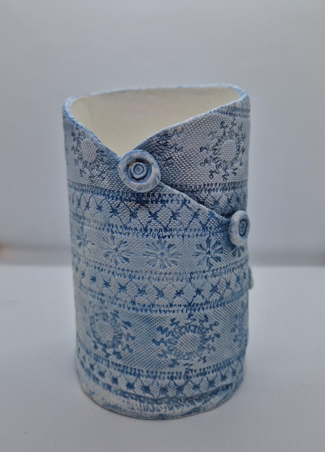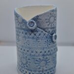My pieces are inspired by nature, books, photographs, vintage lace and are intended for people as gifts or to brighten up your own home with some loveliness. I use fine pieces of antique lace or nature, to print onto the clay. It is biscuit fired to then under glaze, mainly with blues and turquoise, as these are my favourite colours and of course, colour highlights the pretty detail that I am drawn to. There is varying degrees of translucency in my pieces depending on the form and thinness of clay.